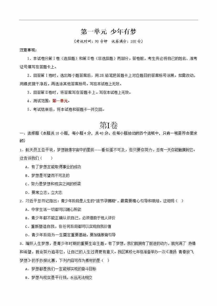 首页 > 全部 > 单元检测 > 第一单元 少年有梦 【单元测试·提升卷】 (学生版)