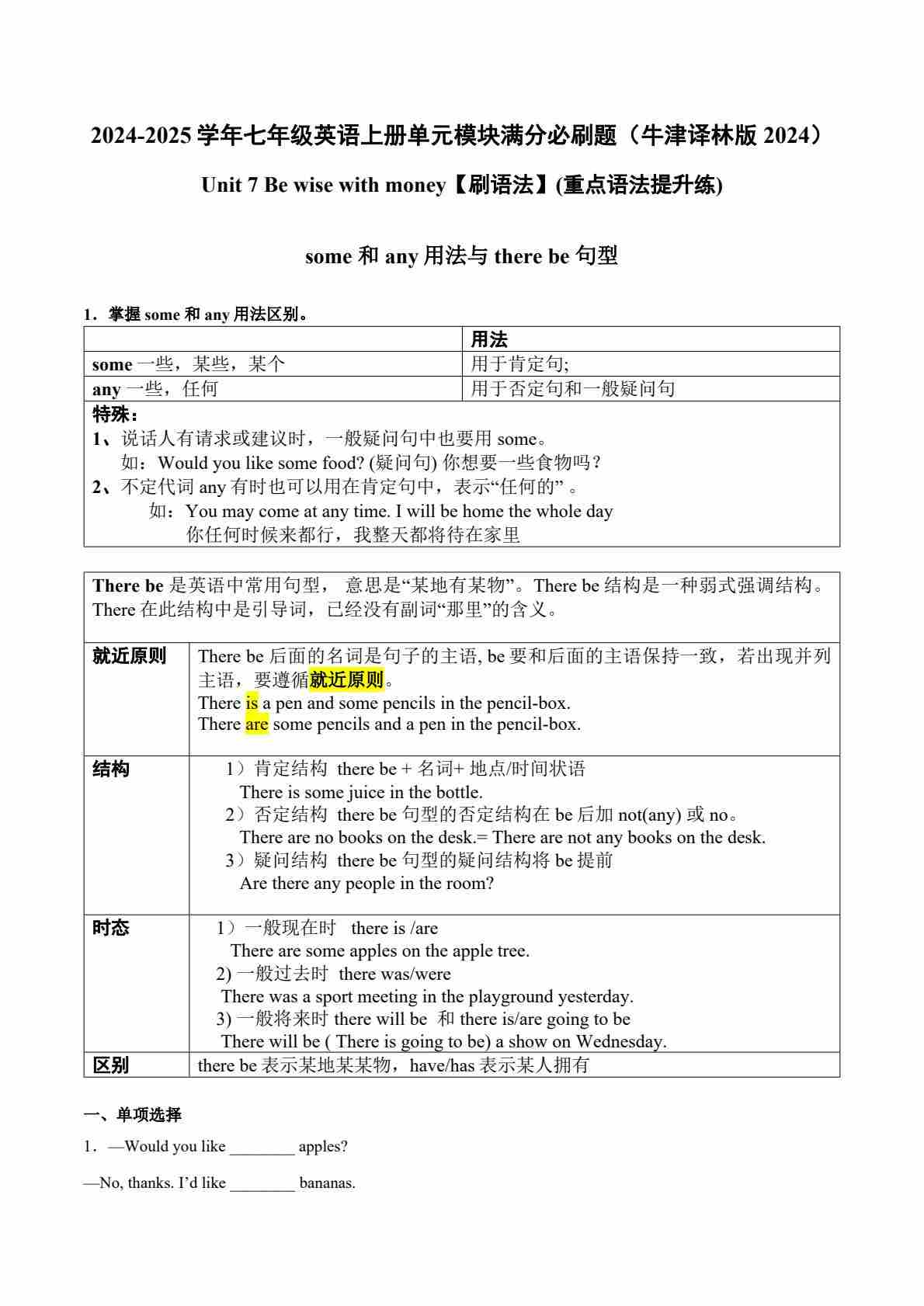 首页 > 全部 > 单元必刷题 > Unit 7【刷语法】some 和any用法与 there be 句型(重点语法提升练)-2024-2025学年七年级英语上册单元模块满分必刷题(牛津译林版2024)