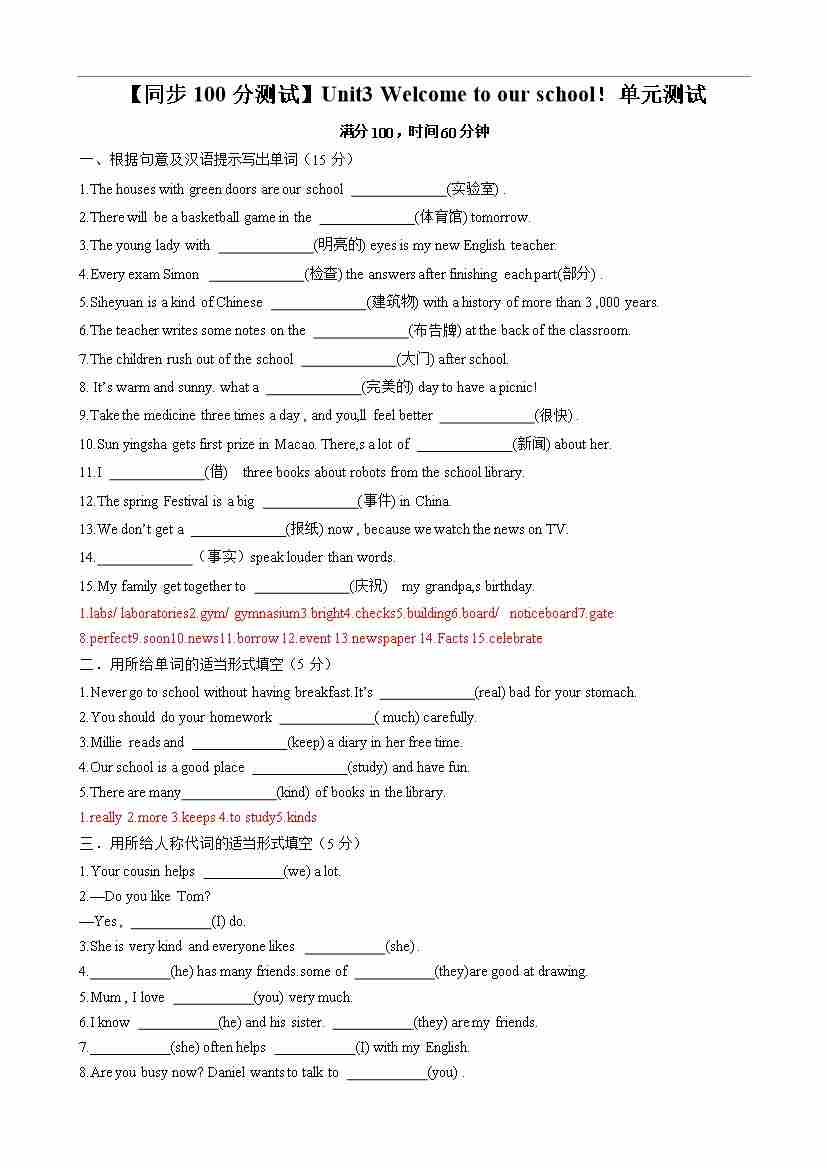 首页 > 全部 > 单元测试 > 【同步100分测试】Unit3 Welcome to our school!单元测试(解析版)-2024-2025学年七年级上册同步单元测试(牛津译林版2024)