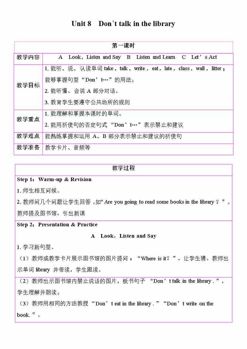 首页 > 全部 > 课件教案 > Unit 8 Don’t talk in the library(教学设计)