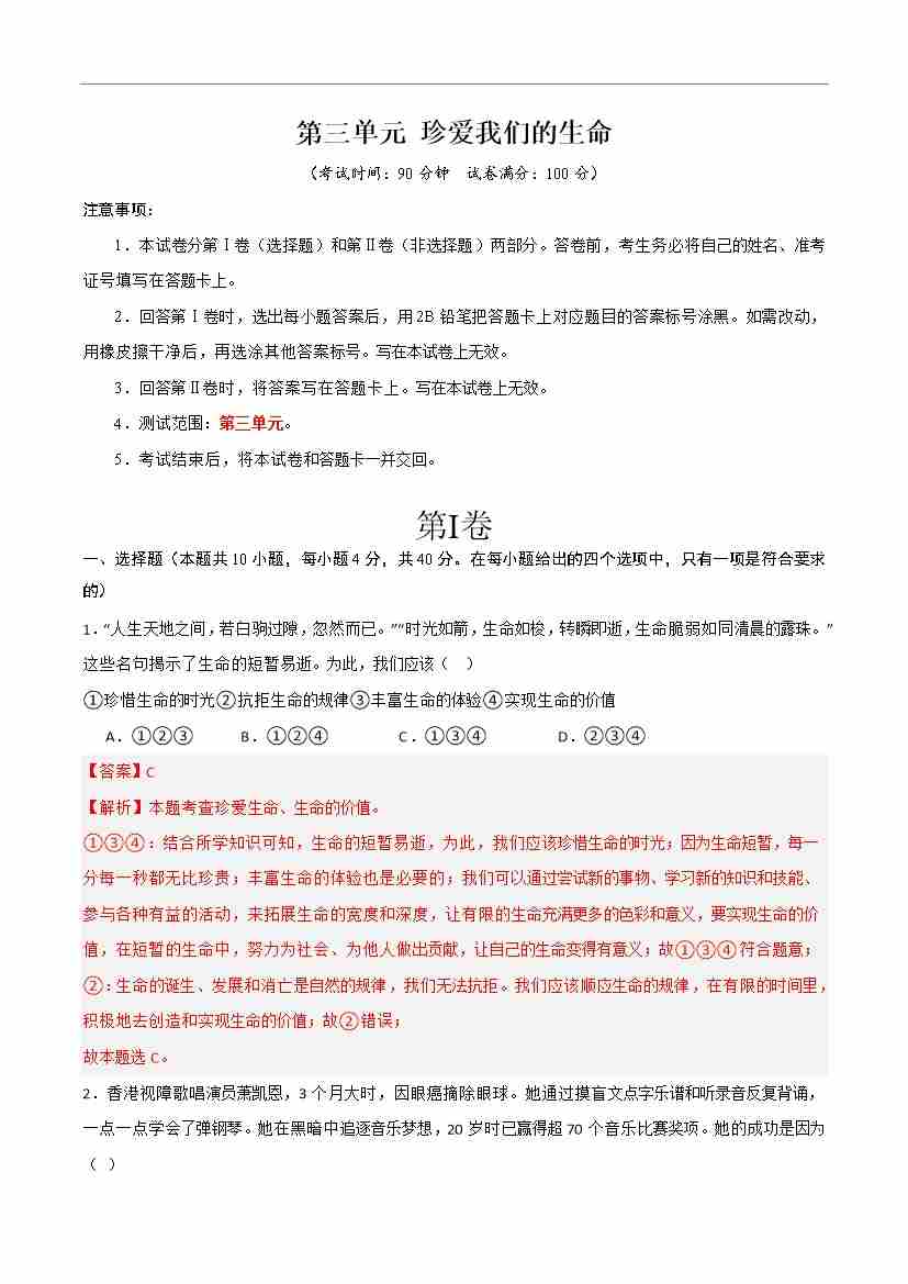 首页 > 全部 > 单元检测 > 第三单元 珍爱我们的生命 【单元测试·提升卷】 (解析版)