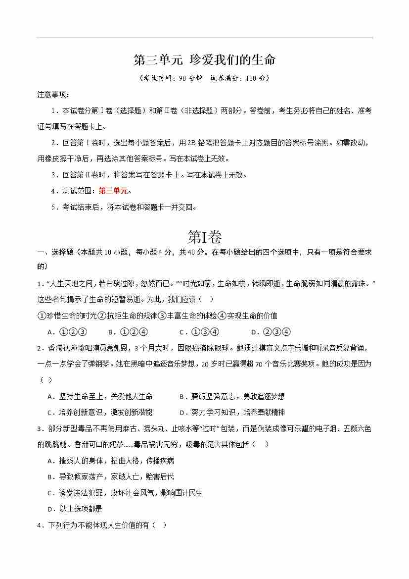 第三单元 珍爱我们的生命 【单元测试·提升卷】 (学生版)