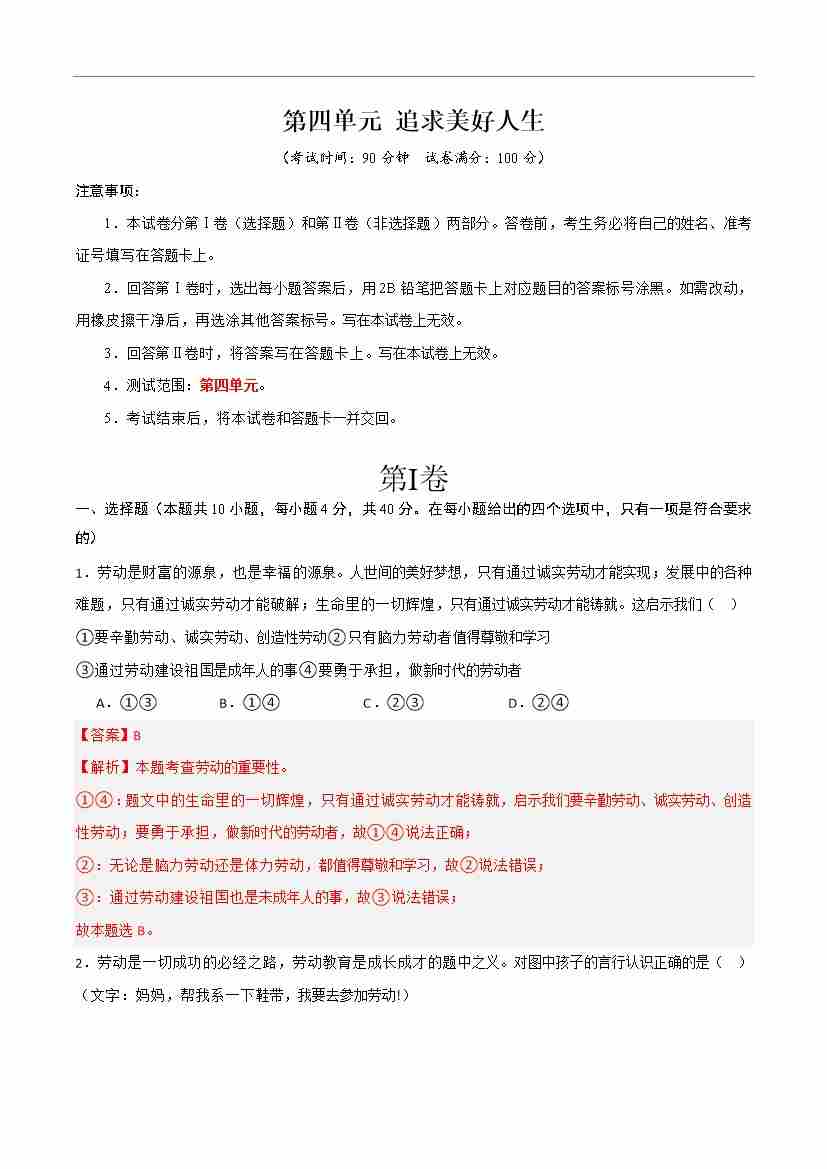 首页 > 全部 > 单元检测 > 第四单元 追求美好人生 【单元测试·提升卷】 (解析版)