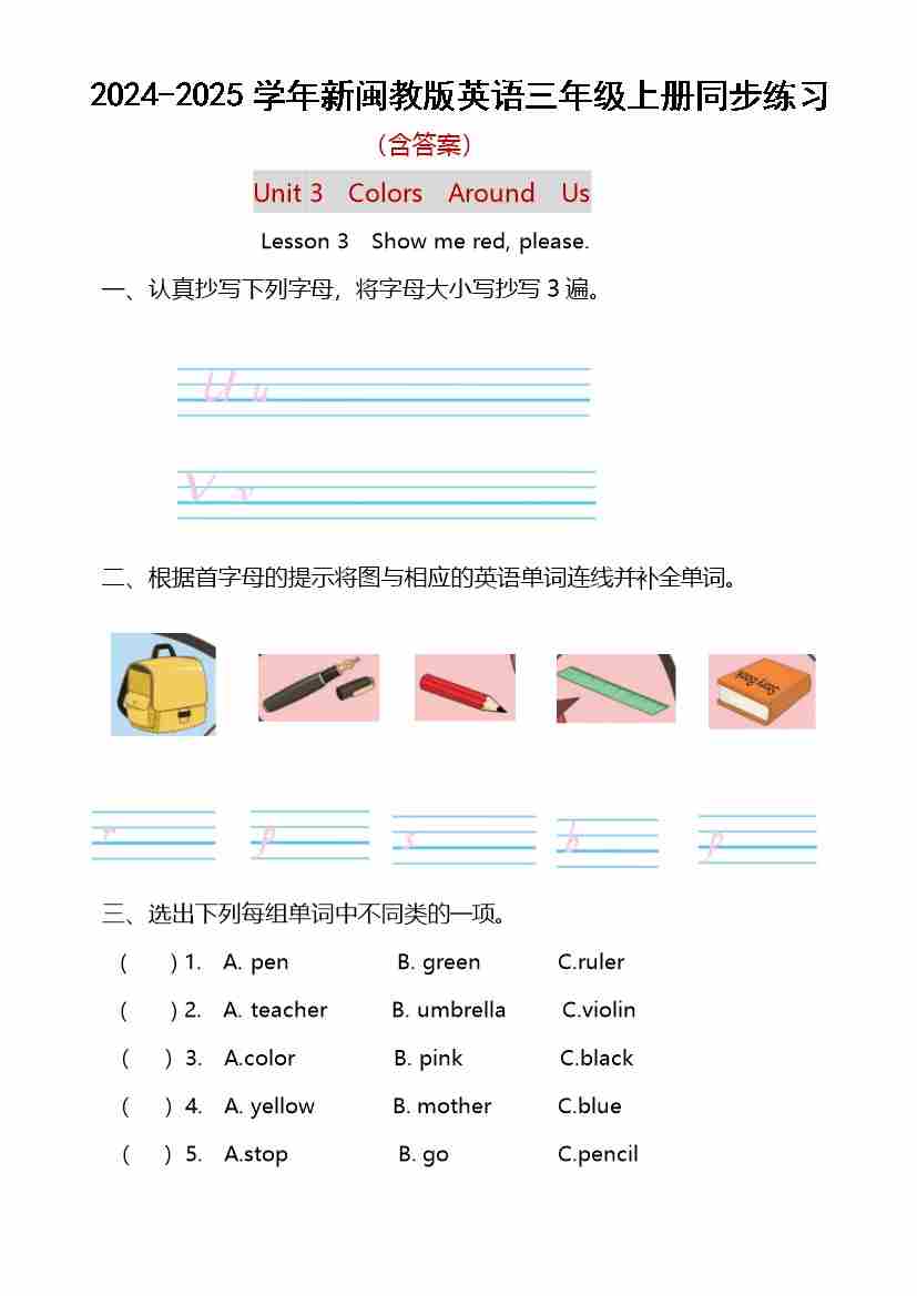 首页 > 全部 > 同步练习 > Unit 3 Colors Around Us Lesson 3 Show me red, please. (同步练)-2024-2025学年闽教版(2024)英语三年级上册