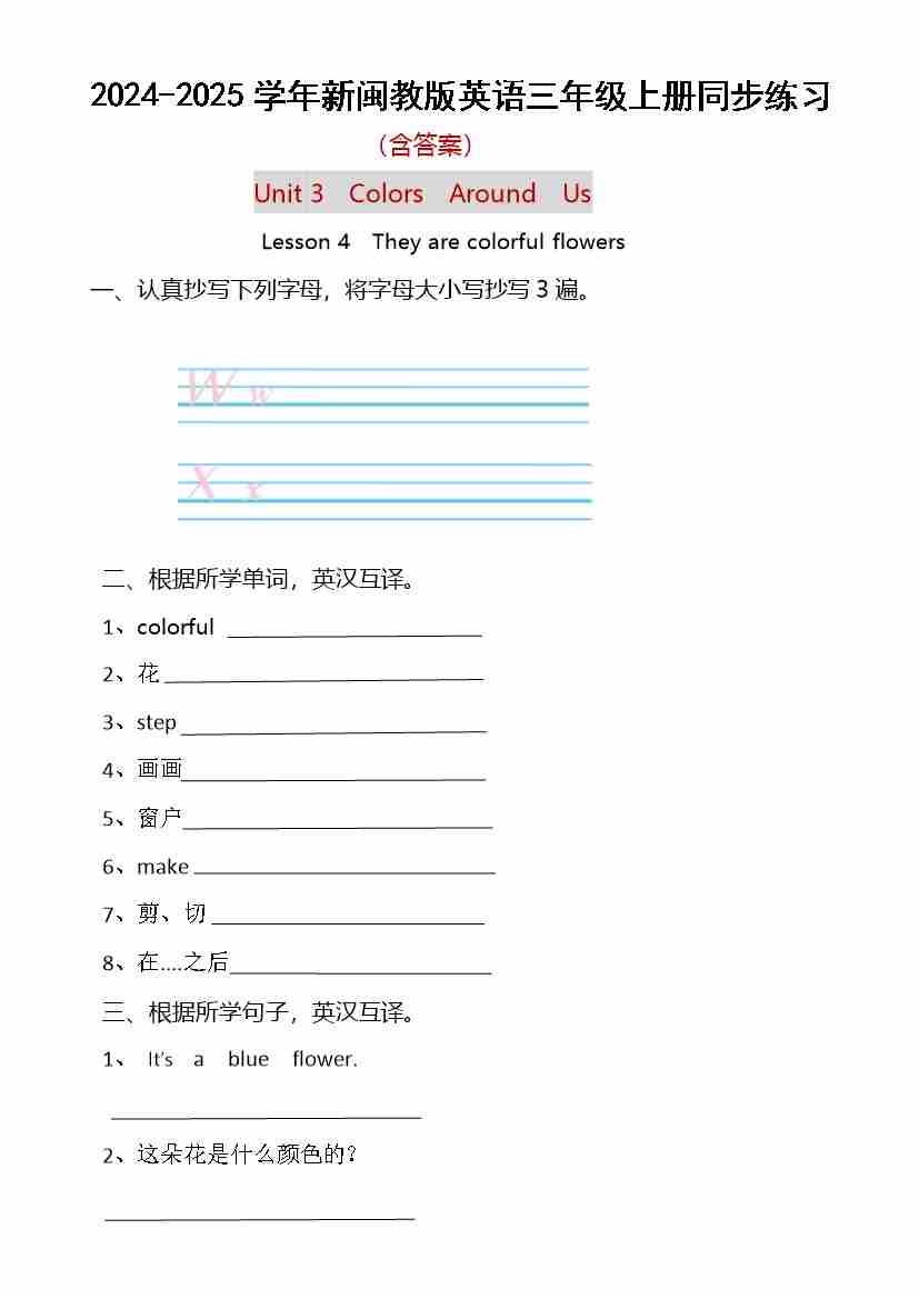 首页 > 全部 > 同步练习 > Unit 3 Colors Around Us Lesson 4 They are colorful flowers (同步练)-2024-2025学年闽教版(2024)英语三年级上册