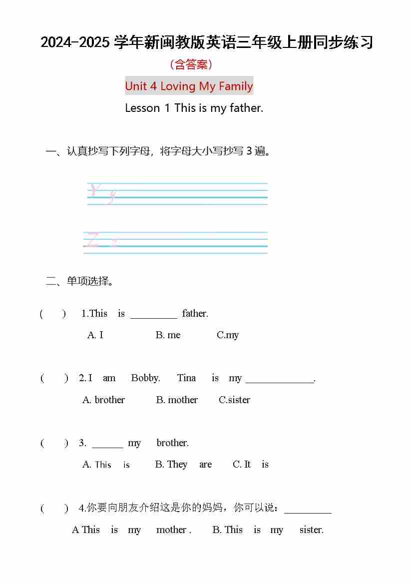 首页 > 全部 > 同步练习 > Unit 4 Loving My Family Lesson 1 This is my father.(同步练)-2024-2025学年闽教版(2024)英语三年级上册