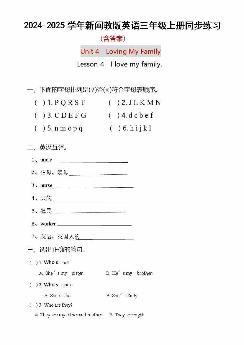 首页 > 全部 > 同步练习 > Unit 4 Loving My Family Lesson 4 I love my family. (同步练习)-2024-2025学年新闽教版英语三年级上册