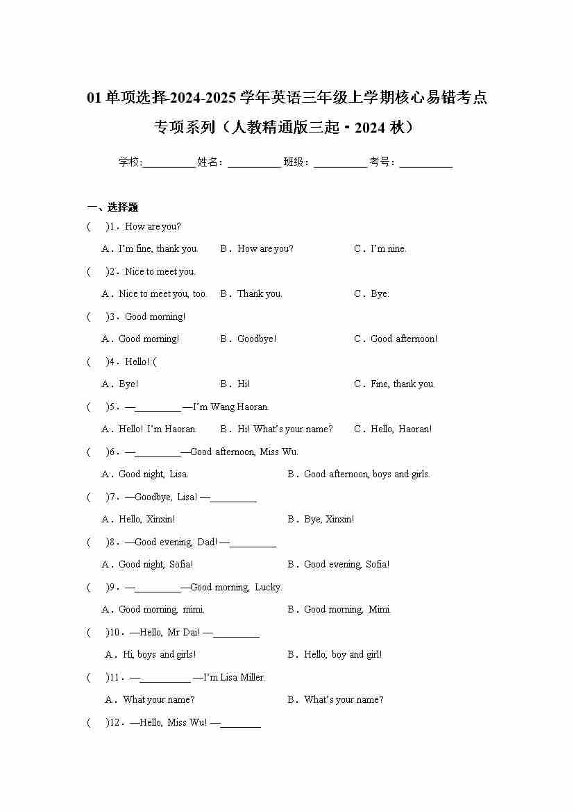 首页 > 全部 > 专项练习 > 01单项选择-2024-2025学年英语三年级上学期核心易错考点专项系列(人教精通版三起·2024秋)