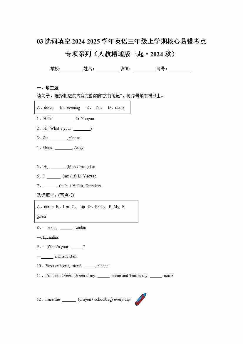首页 > 全部 > 专项练习 > 03选词填空-2024-2025学年英语三年级上学期核心易错考点专项系列(人教精通版三起·2024秋)