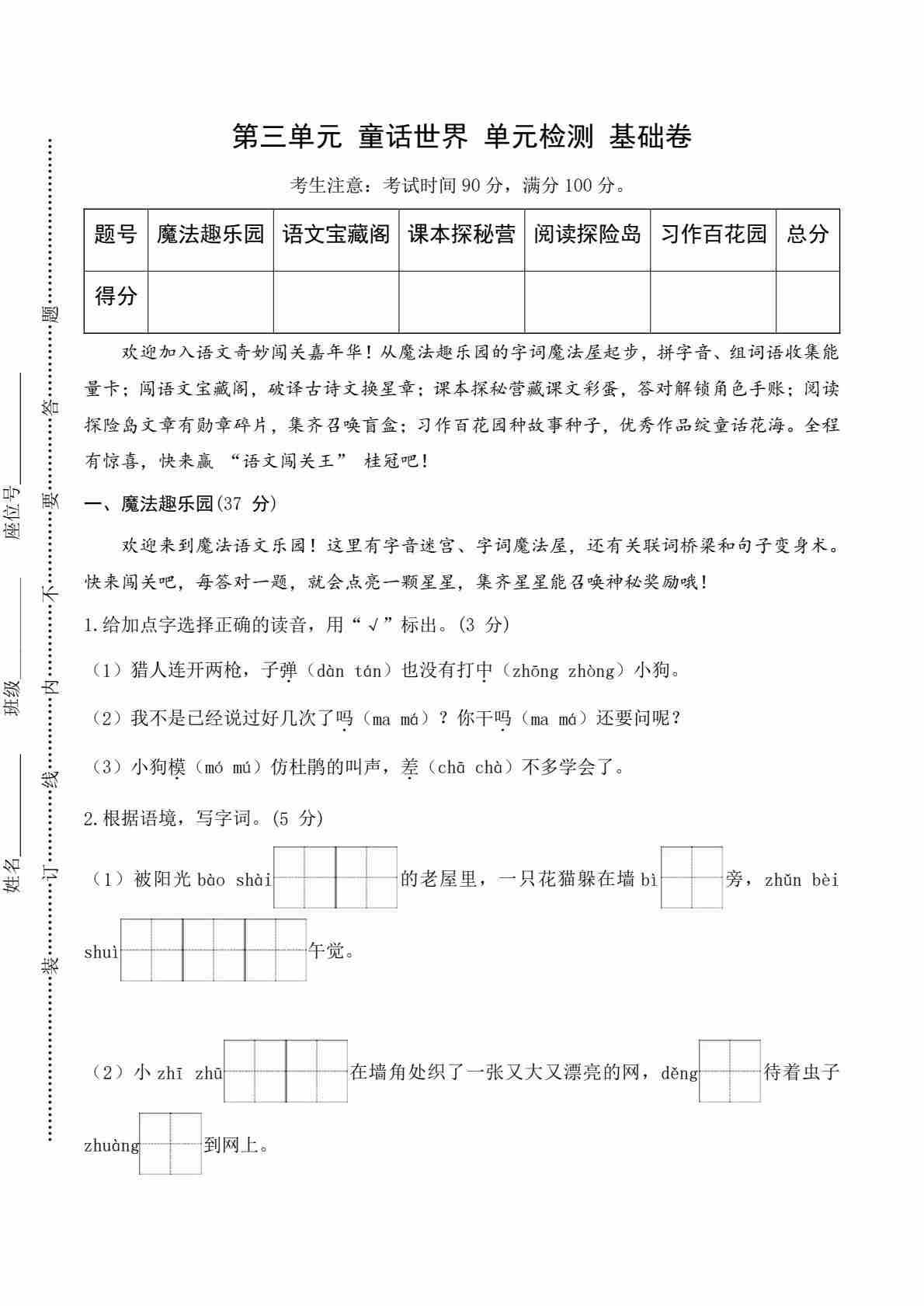 首页 > 全部 > 单元测试 > 三年级(上)语文 第三单元 童话世界(单元测试·基础卷)