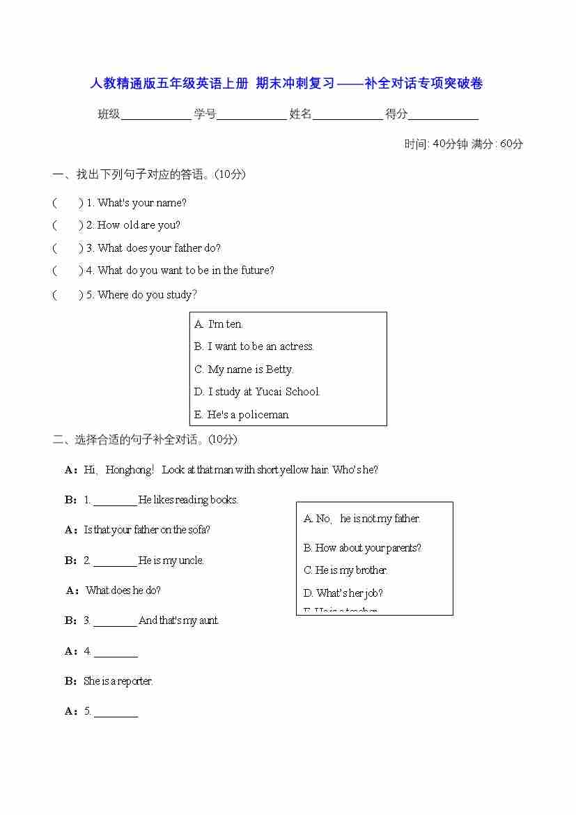人教精通版五年级英语上册 期末冲刺复习——补全对话专项突破卷【含答案】