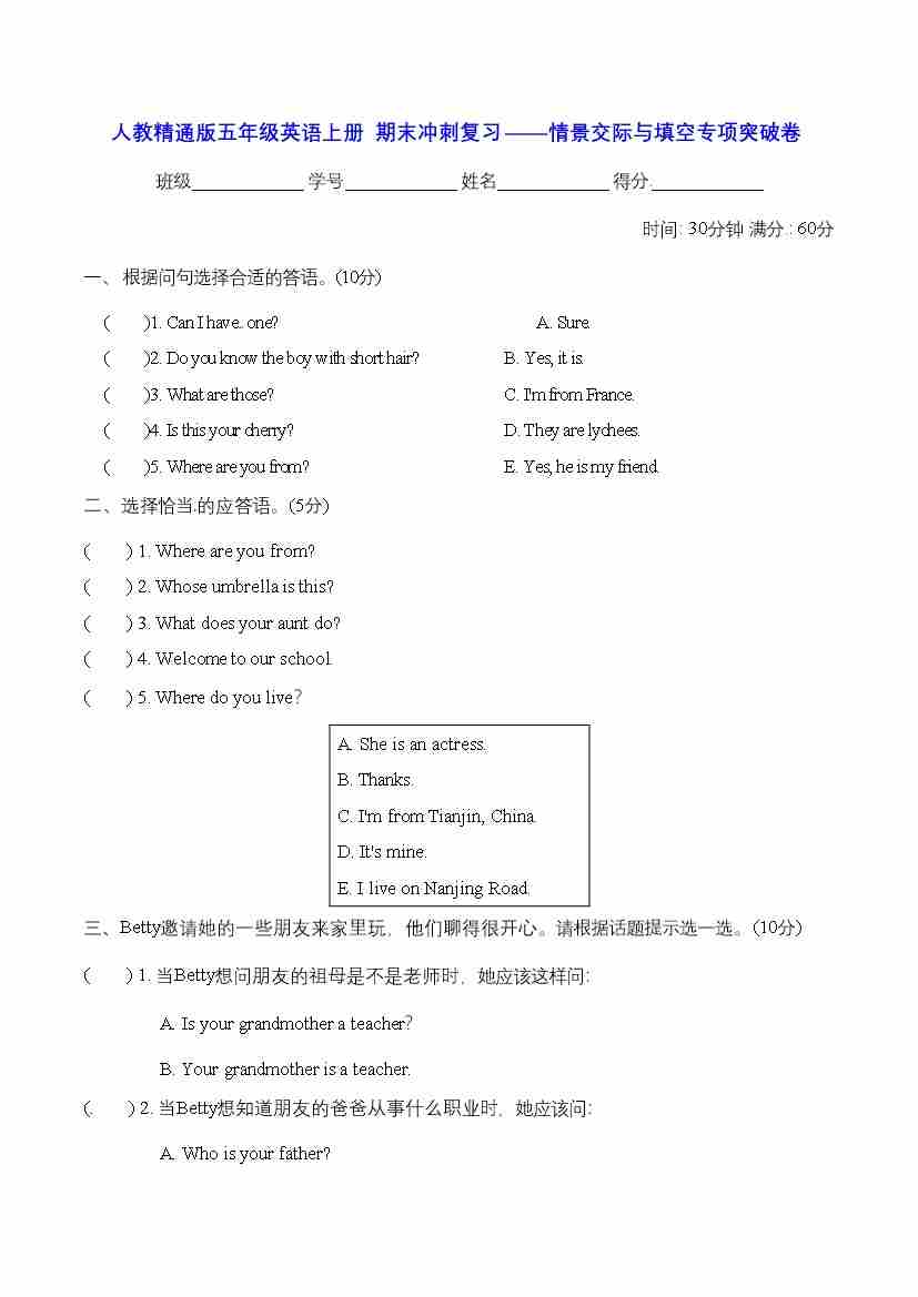 首页 > 全部 > 期末专项 > 人教精通版五年级英语上册 期末冲刺复习——情景交际与填空专项突破卷【含答案】