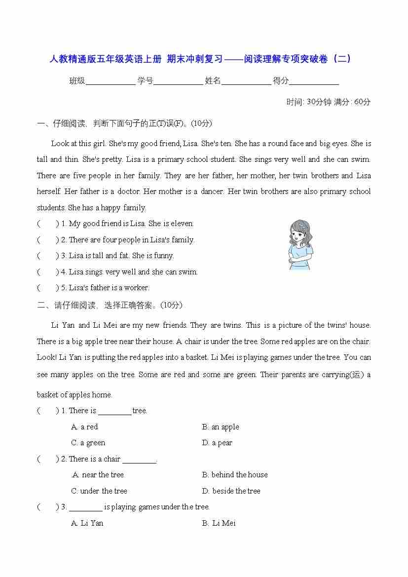 人教精通版五年级英语上册 期末冲刺复习——阅读理解专项突破卷(二)【含答案】