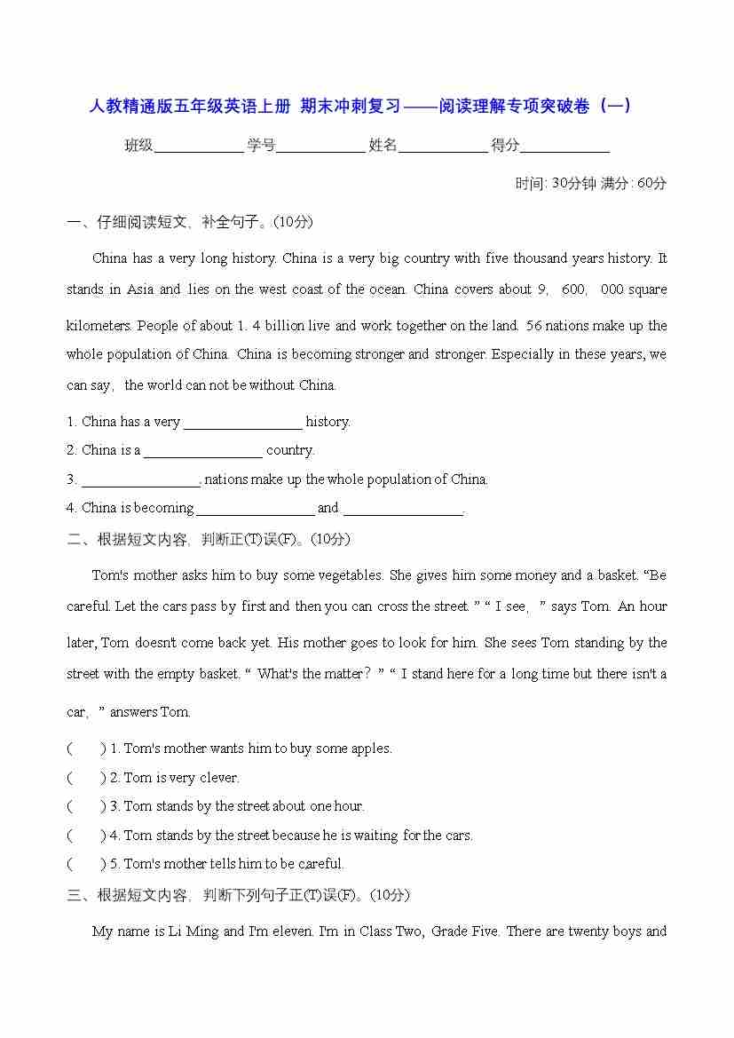 首页 > 全部 > 期末专项 > 人教精通版五年级英语上册 期末冲刺复习——阅读理解专项突破卷(一)【含答案】