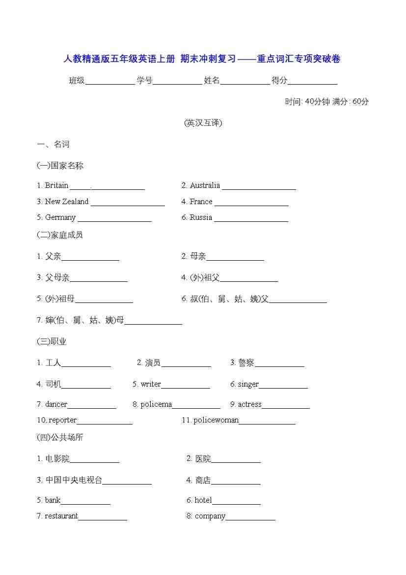 首页 > 全部 > 期末专项 > 人教精通版五年级英语上册 期末冲刺复习——重点词汇专项突破卷【含答案】