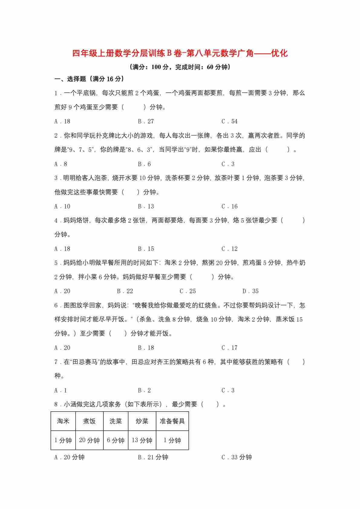 首页 > 全部 > 单元测试 > 四年级(上)数学 第八单元《数学广角—优化》分层训练B卷