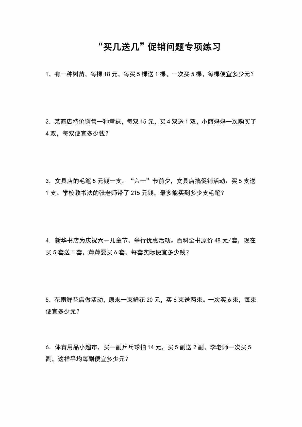 首页 > 全部 > 专项练习 > 四年级(上)数学 “买几送几”促销问题专项练习
