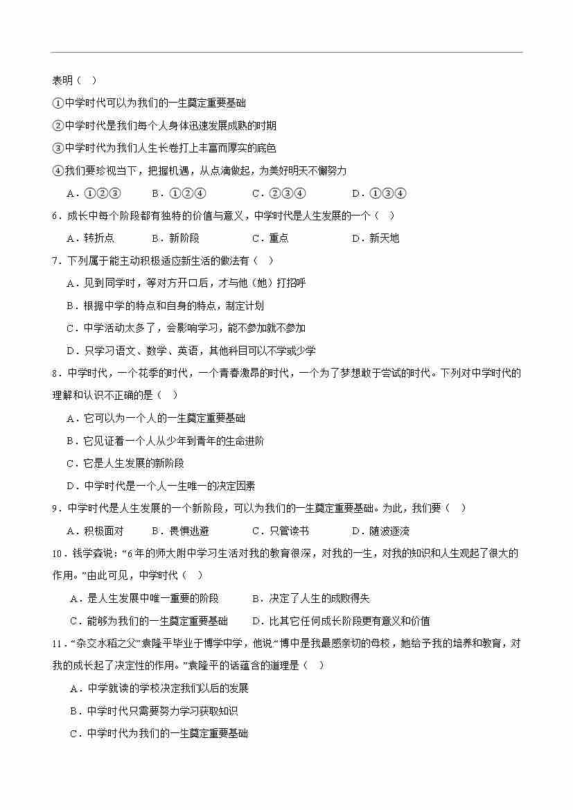 首页 > 全部 > 期末专项 > 专题01 开启初中生活(高频选择题40题)(原卷版)