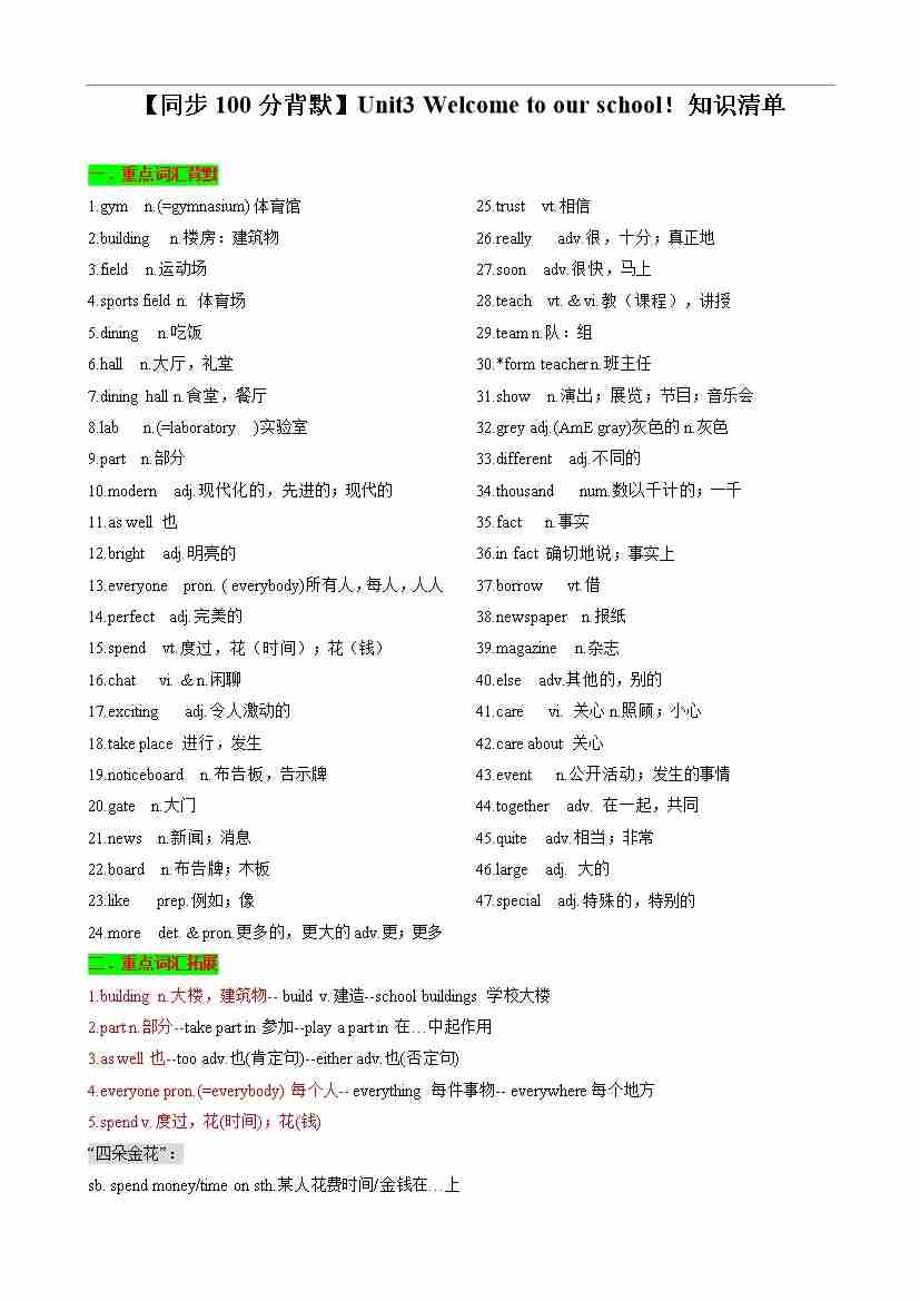 【同步100分背默】Unit3 Welcome to our school!知识清单(记忆版)-2024-2025学年七年级上册同步知识背默(牛津译林版2024)