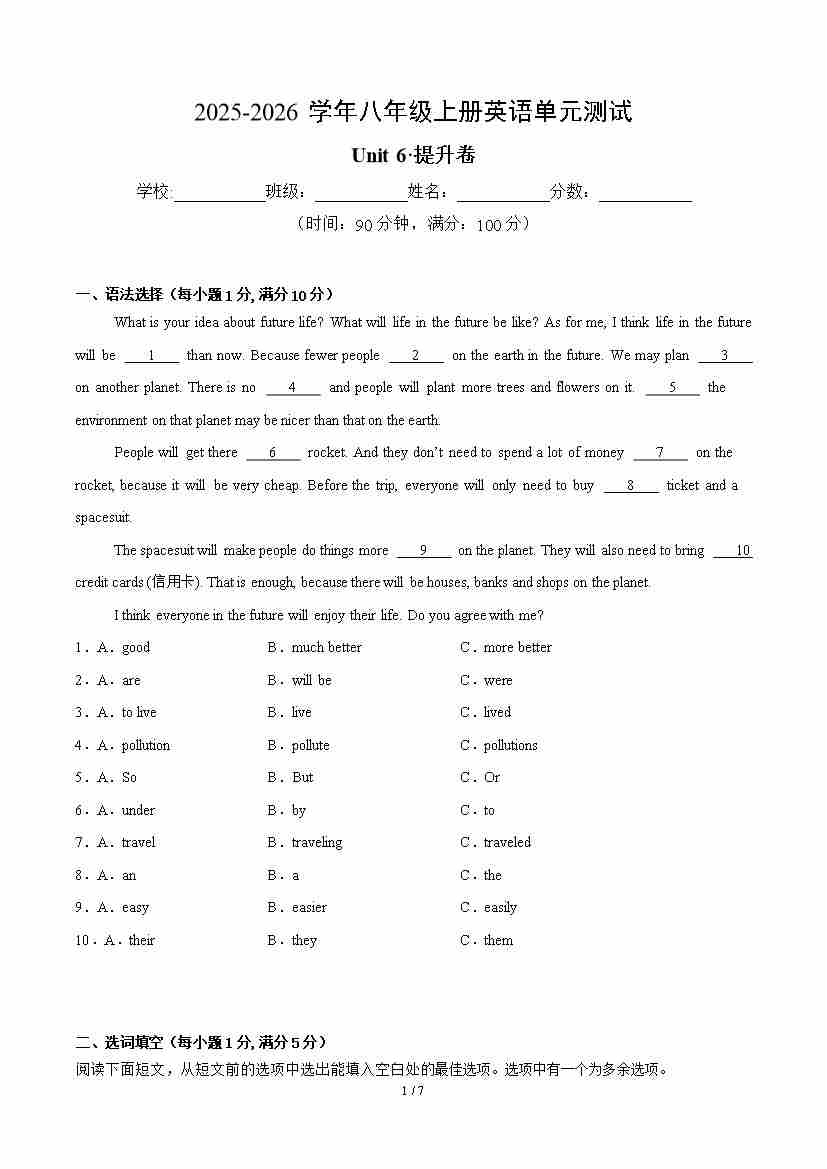 首页 > 全部 > 单元提升卷 > Unit 6 Life in the future(单元测试·提升卷)(原卷版)