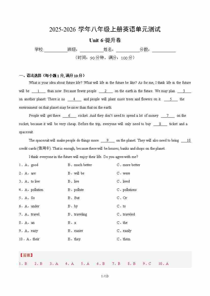 首页 > 全部 > 单元提升卷 > Unit 6 Life in the future(单元测试·提升卷)(解析版)