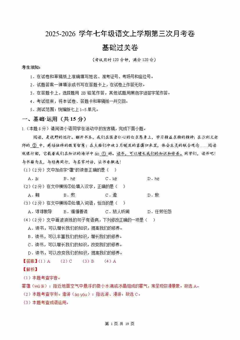 首页 > 全部 > 月考试卷 > 2025七上语文第三次月考卷·基础过关卷(全解全析)(新教材统编版)