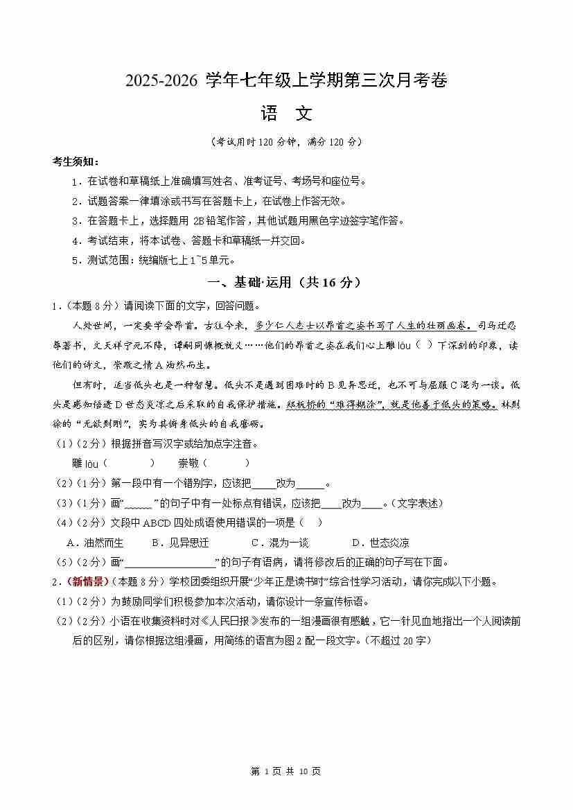 首页 > 全部 > 月考试卷 > 2025七上语文第三次月考卷·重难突破卷(考试版A4)(新教材统编版)