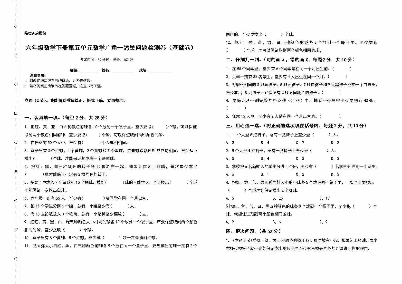 首页 > 全部 > 单元测试 > 六年级数学下册第五单元数学广角—鸽巢问题检测卷(基础卷)(含答案)人教版