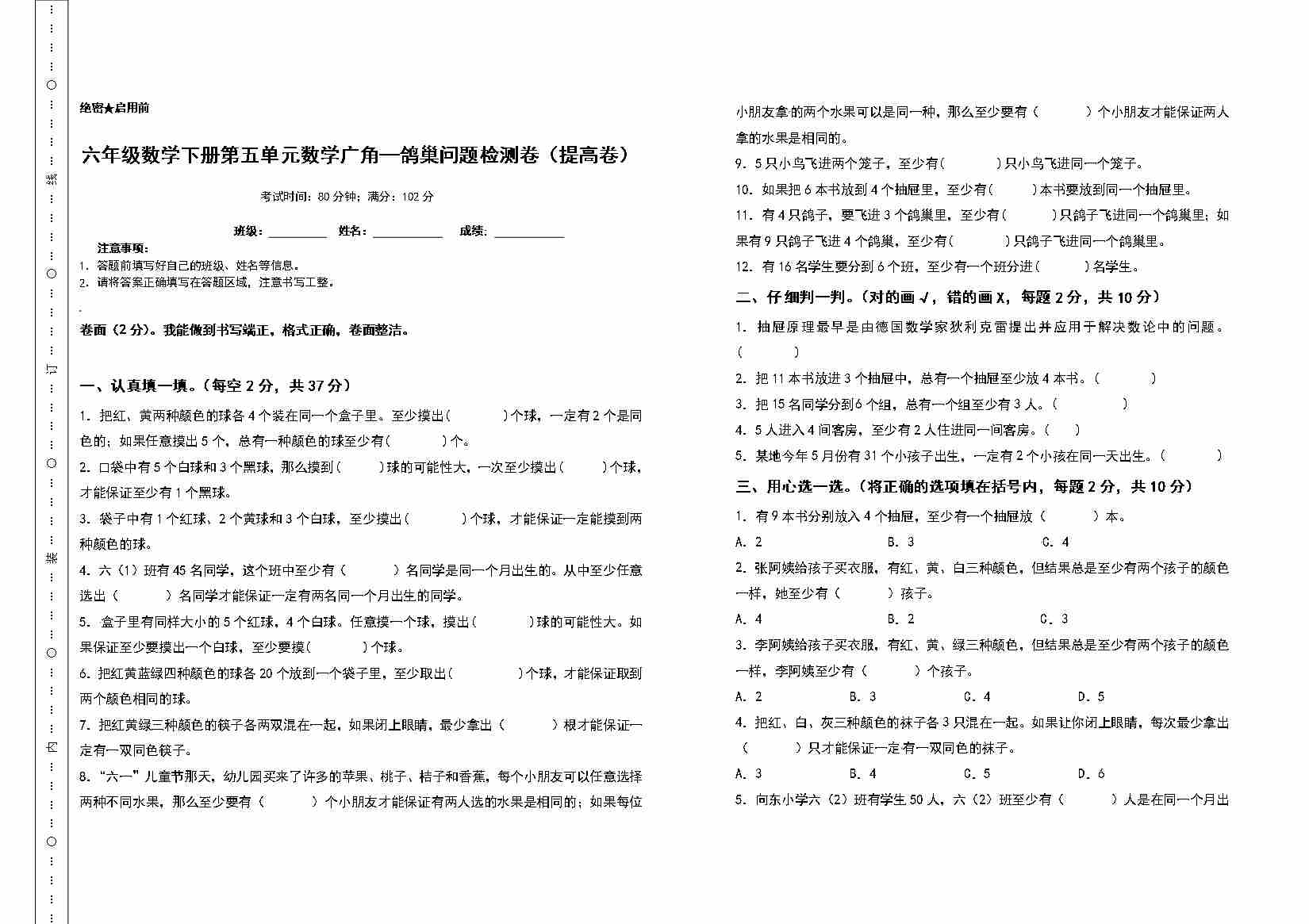 首页 > 全部 > 单元测试 > 六年级数学下册第五单元数学广角—鸽巢问题检测卷(提高卷)(含答案)人教版