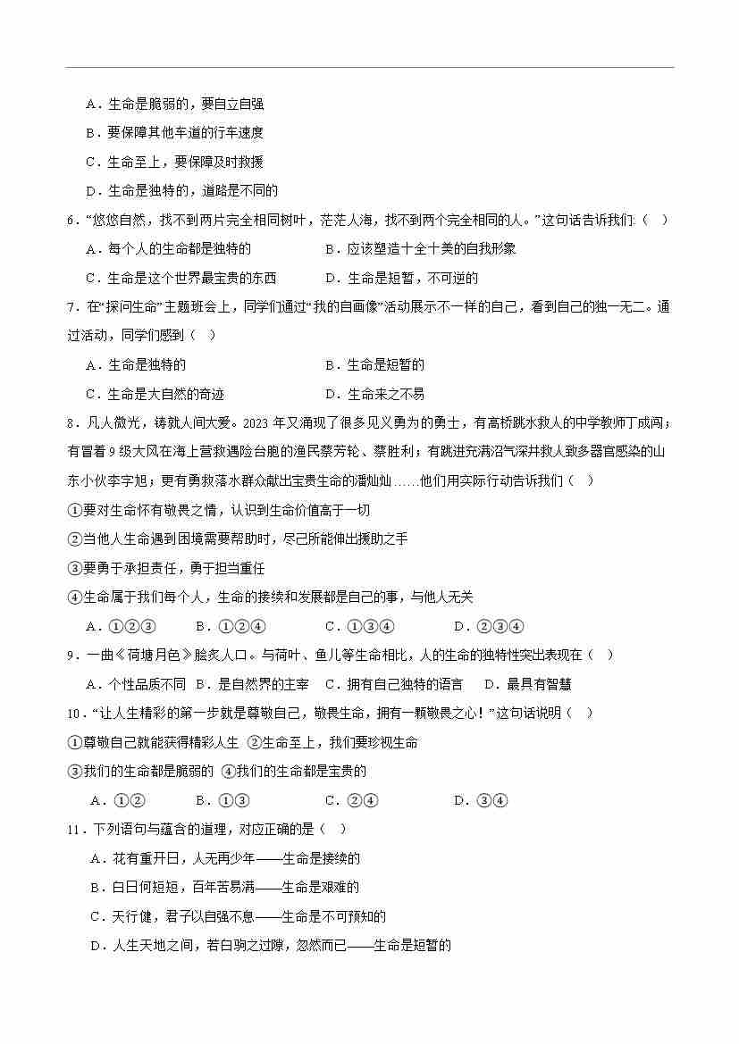 首页 > 全部 > 期末专项 > 专题08 生命可贵(高频选择题40题)(学生版)