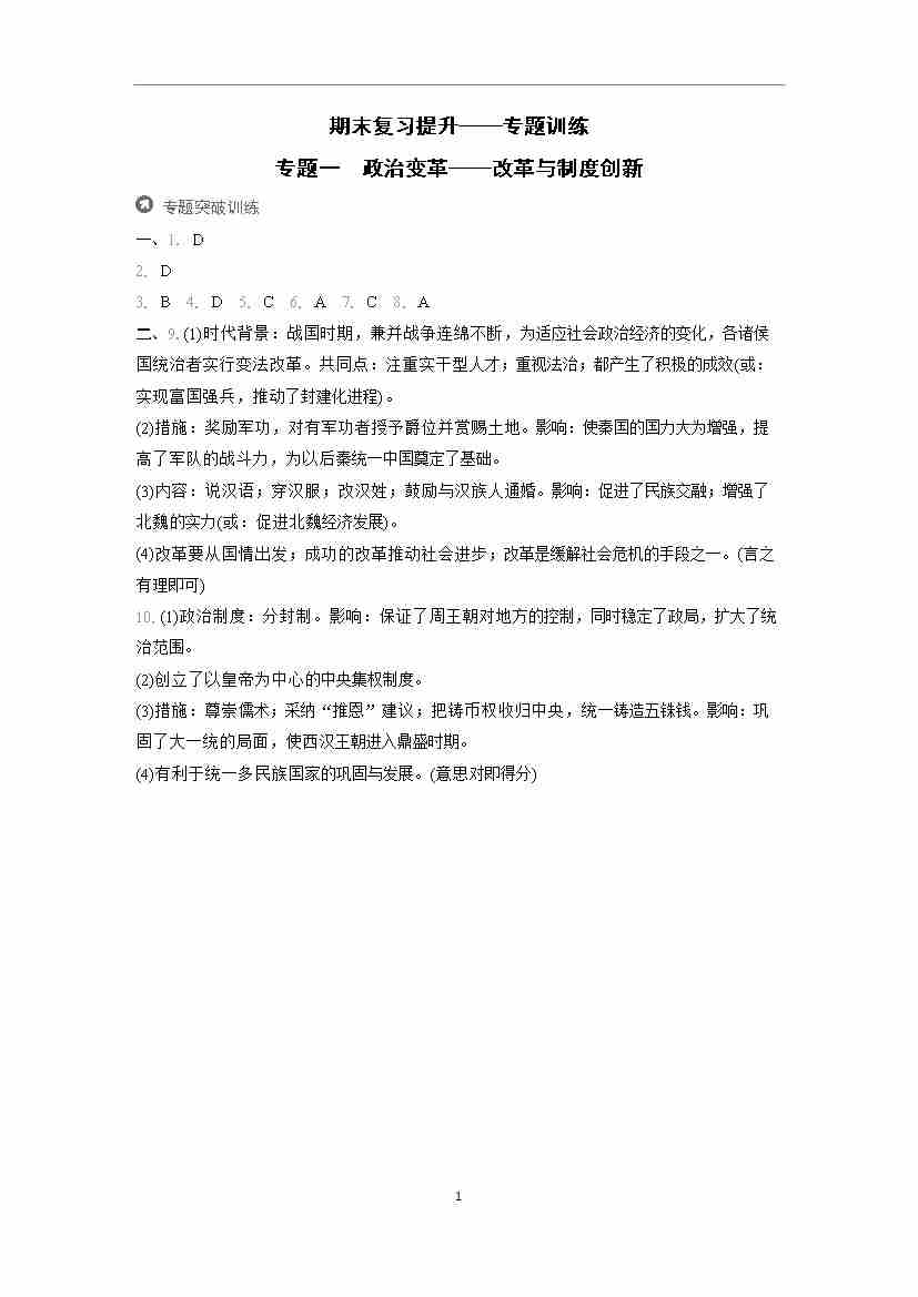 首页 > 全部 > 期末专项题 > 专题训练 专题一 政治变革——改革与制度创新