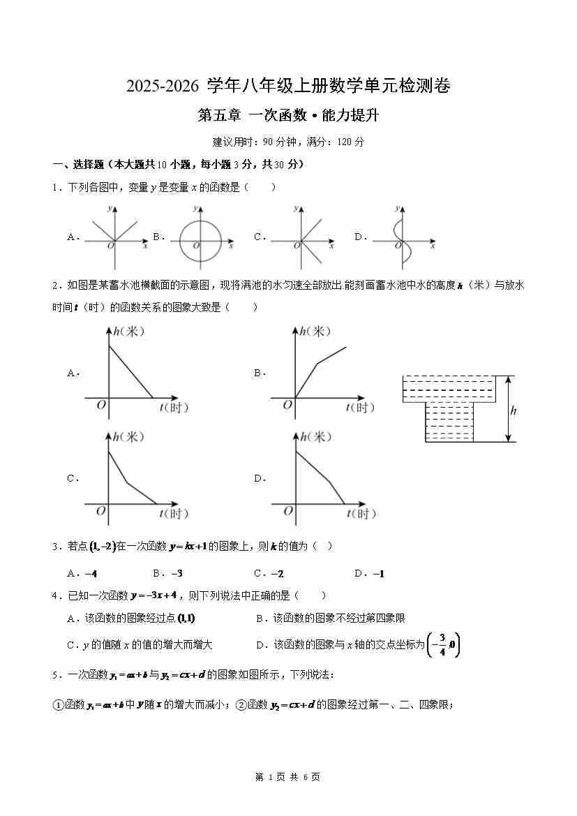 首页 > 全部 > 单元提升卷 > 八上数学第5章 一次函数测试·提升卷(考试版A4)