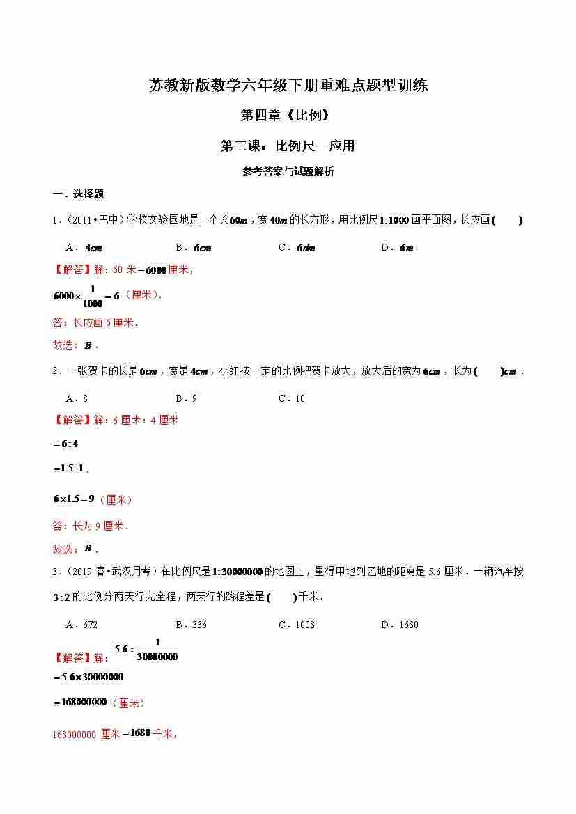 首页 > 全部 > 重难点题型 > 苏教新版数学六年级下册重难点题型训练第四章《比例》第四课:比例尺—应用(解析版)
