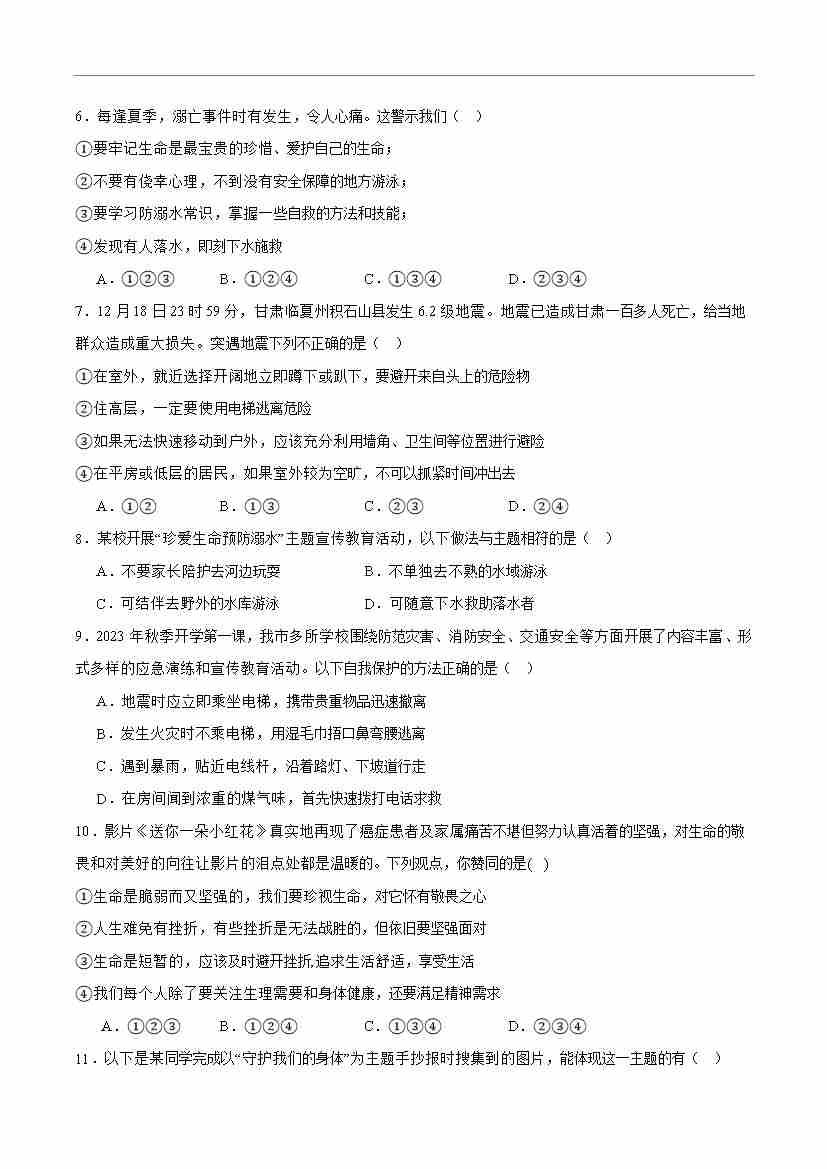 首页 > 全部 > 期末专项 > 专题09 守护生命安全(高频选择题40题)(学生版)
