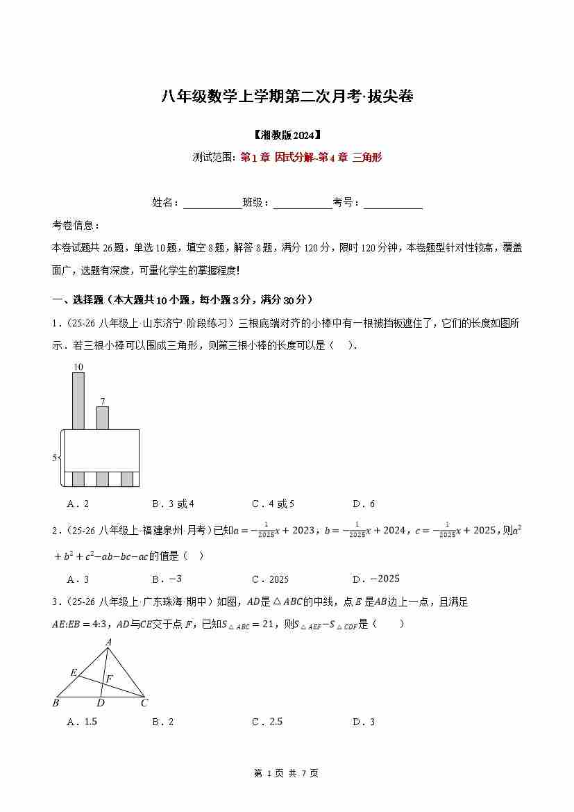 八年级数学上学期第二次月考·拔尖卷(湘教版2024)(原卷版)