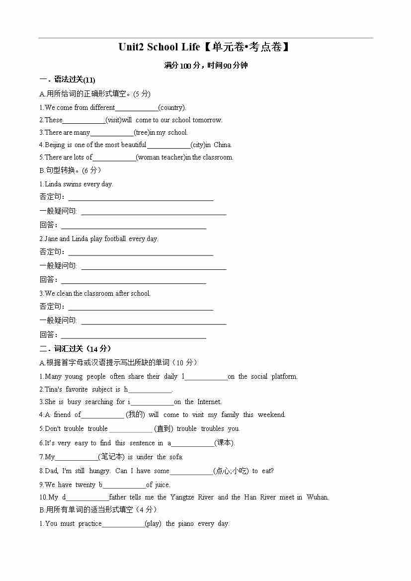首页 > 全部 > 单元考点卷 > Unit2 School Life【单元卷•考点卷】-2024-2025学年七年级英语上册单元速记•巧练(北师大版2024)(原卷版)