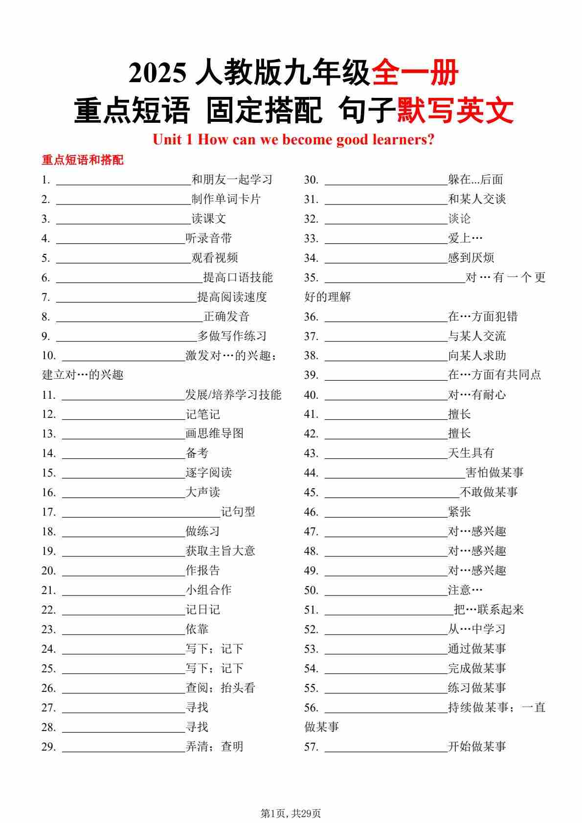 2025人教版全一册短语,固定搭配,句子-默写英文——按单元分页