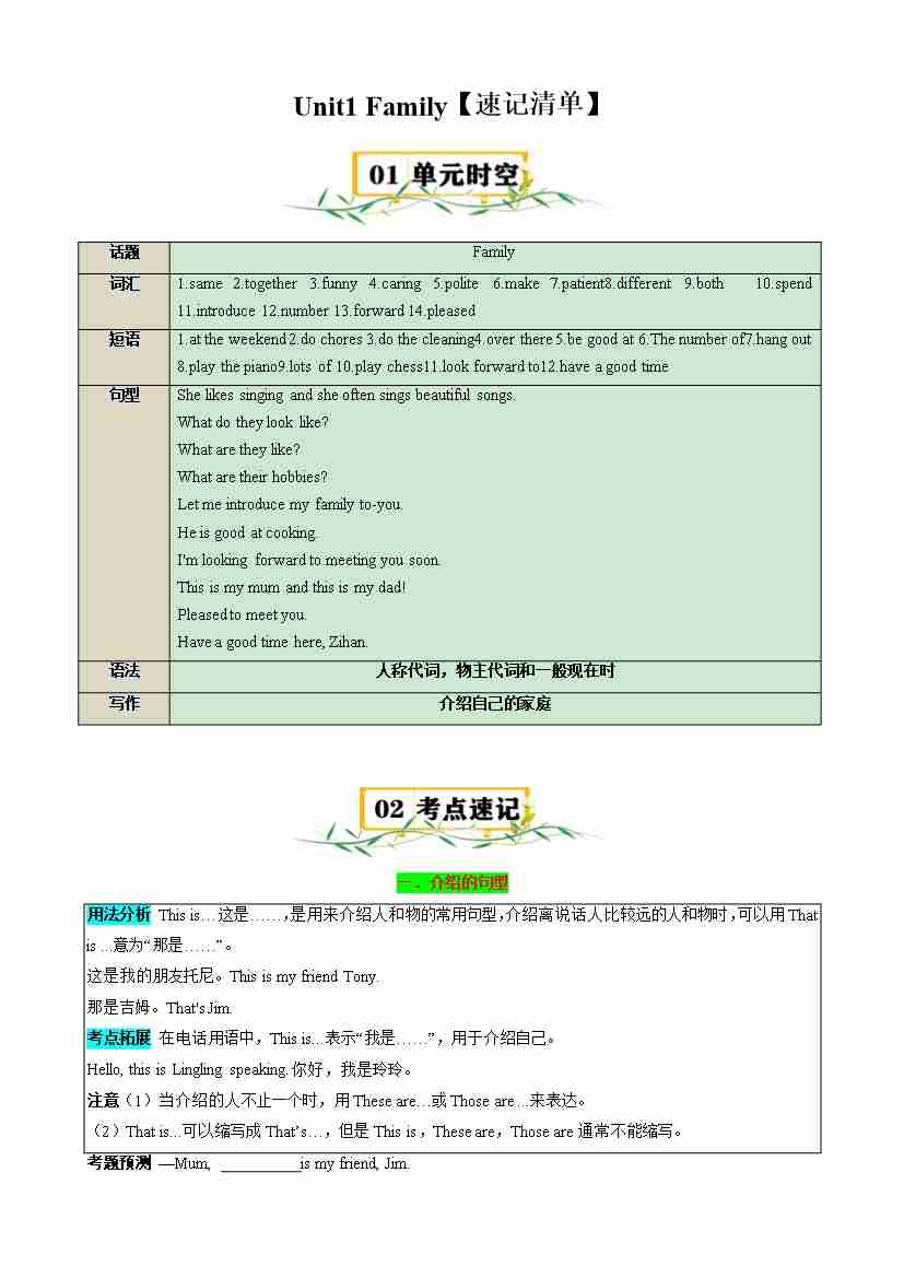 首页 > 全部 > 速记清单 > Unit1 Family 【速记清单】-2024-2025学年七年级英语上册单元速记•巧练(北师大版2024)(原卷版)
