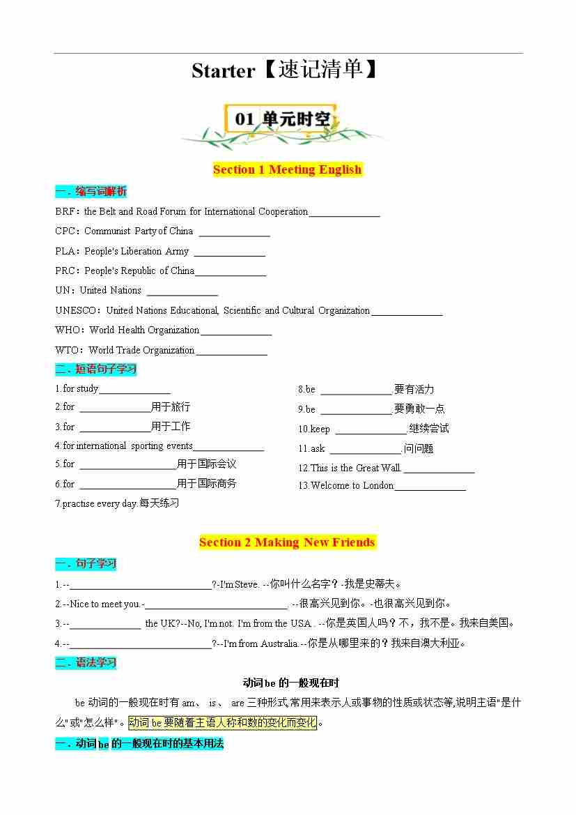 首页 > 全部 > 速记清单 > Starter【速记清单】-2024-2025学年七年级英语上册单元速记•巧练(北师大版2024)(原卷版)