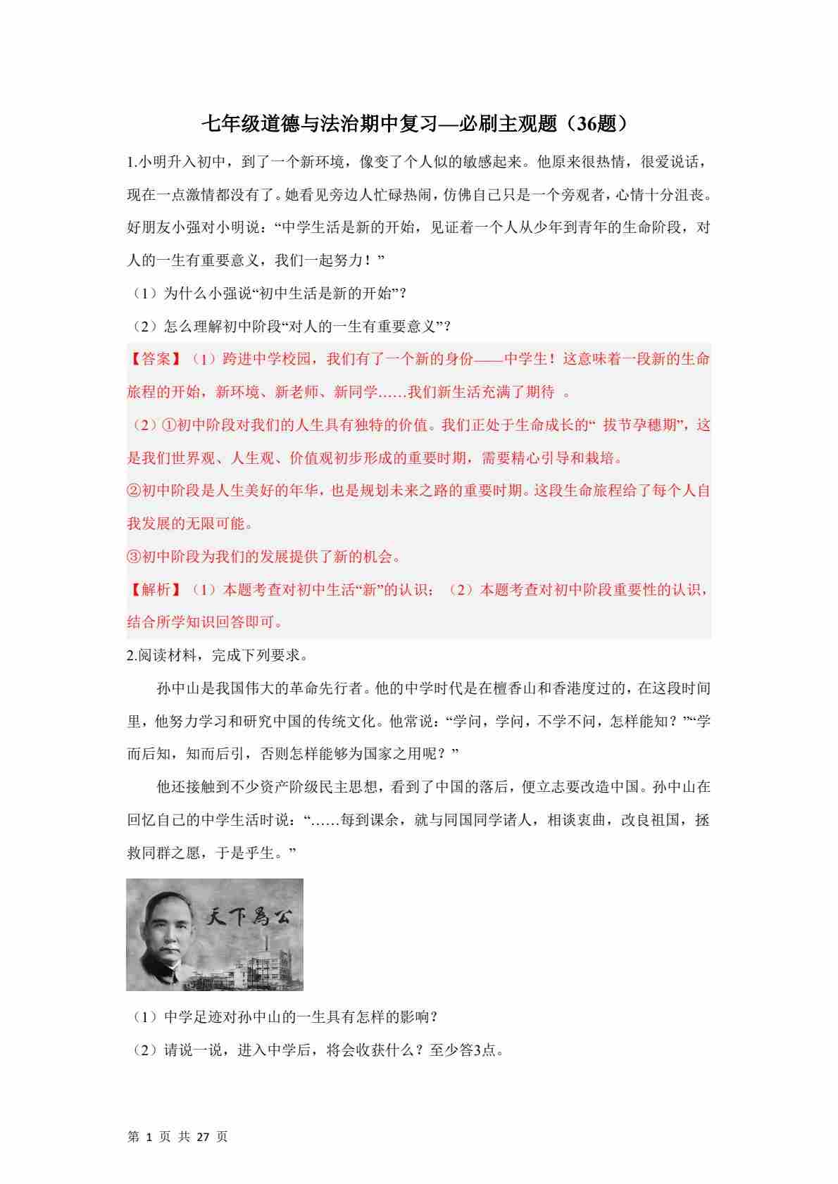 七年级道德与法治期中复习—必刷主观题(36题)(解析版)