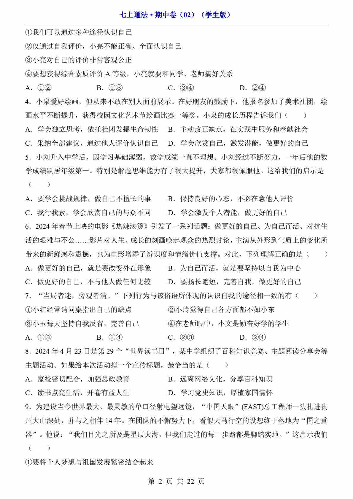 首页 > 全部 > 期中试卷 > 7上道法期中卷02【第1-2单元】