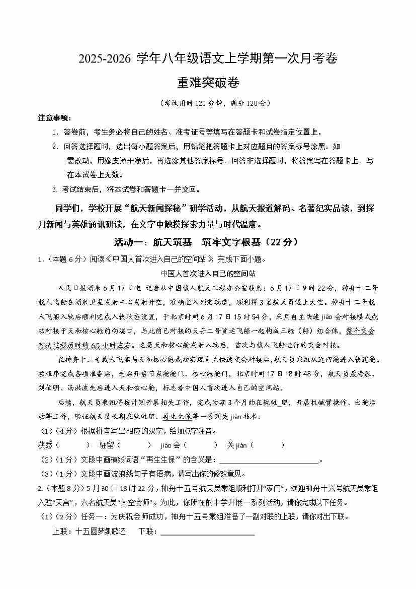 统编版2024八年级语文第一次月考卷·重难突破卷(考试版A4)