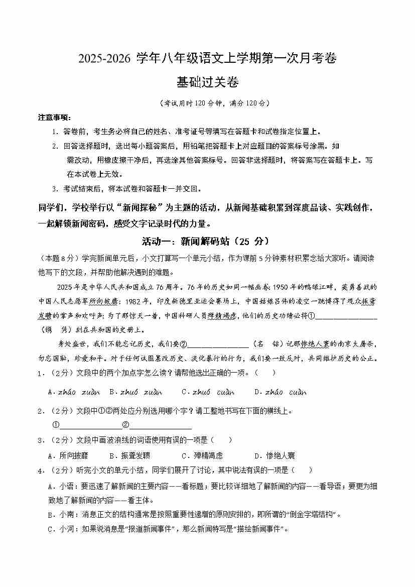 统编版2024八年级语文第一次月考卷·基础过关卷(全解全析)