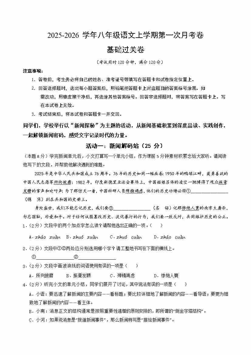 统编版2024八年级语文第一次月考卷·基础过关卷(考试版A4))