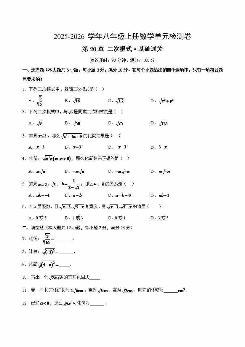 首页 > 全部 > 单元提升卷 > 第20章 二次根式(单元测试·基础卷)(考试版A4)