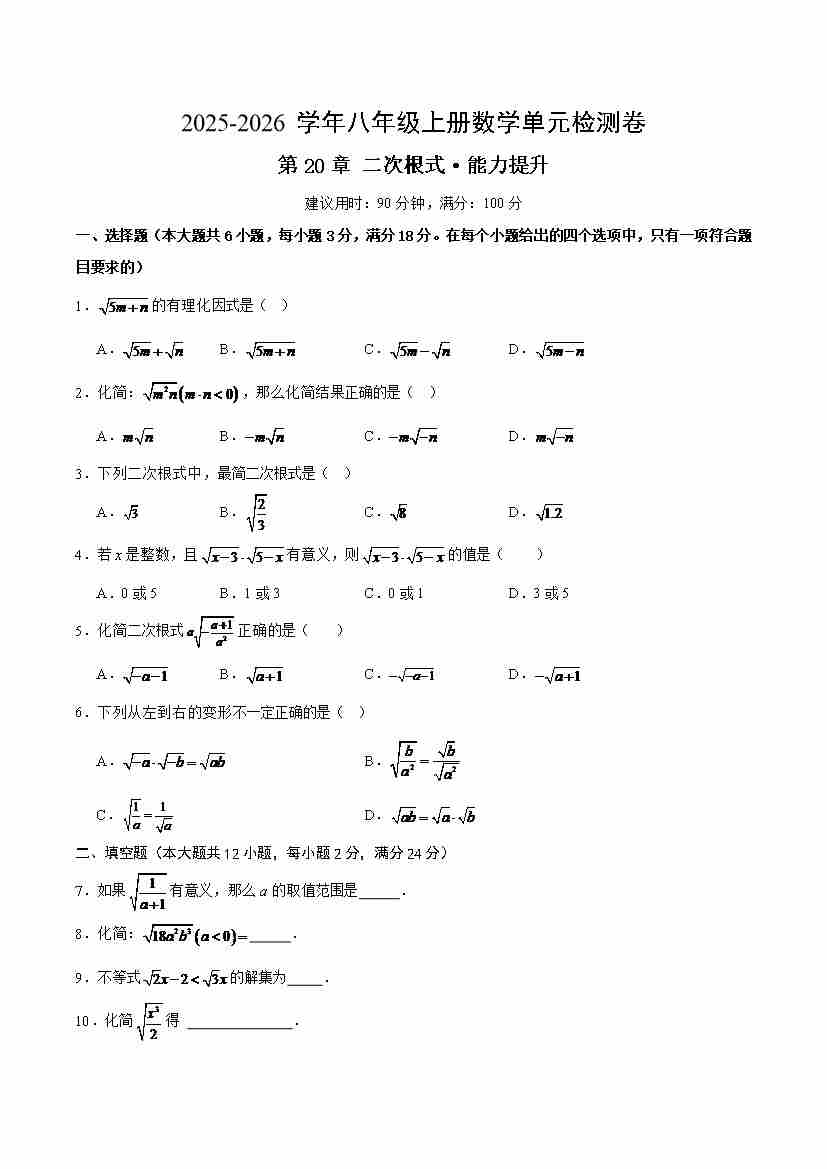 首页 > 全部 > 单元提升卷 > 第20章 二次根式(单元测试·提升卷)(考试版A4)