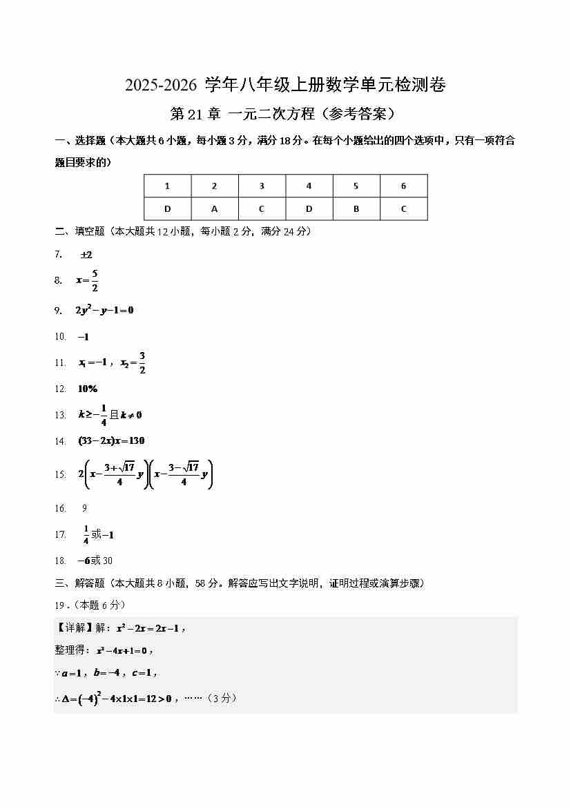 首页 > 全部 > 单元提升卷 > 第21章 一元二次方程(单元测试·基础卷)(答案及评分标准)