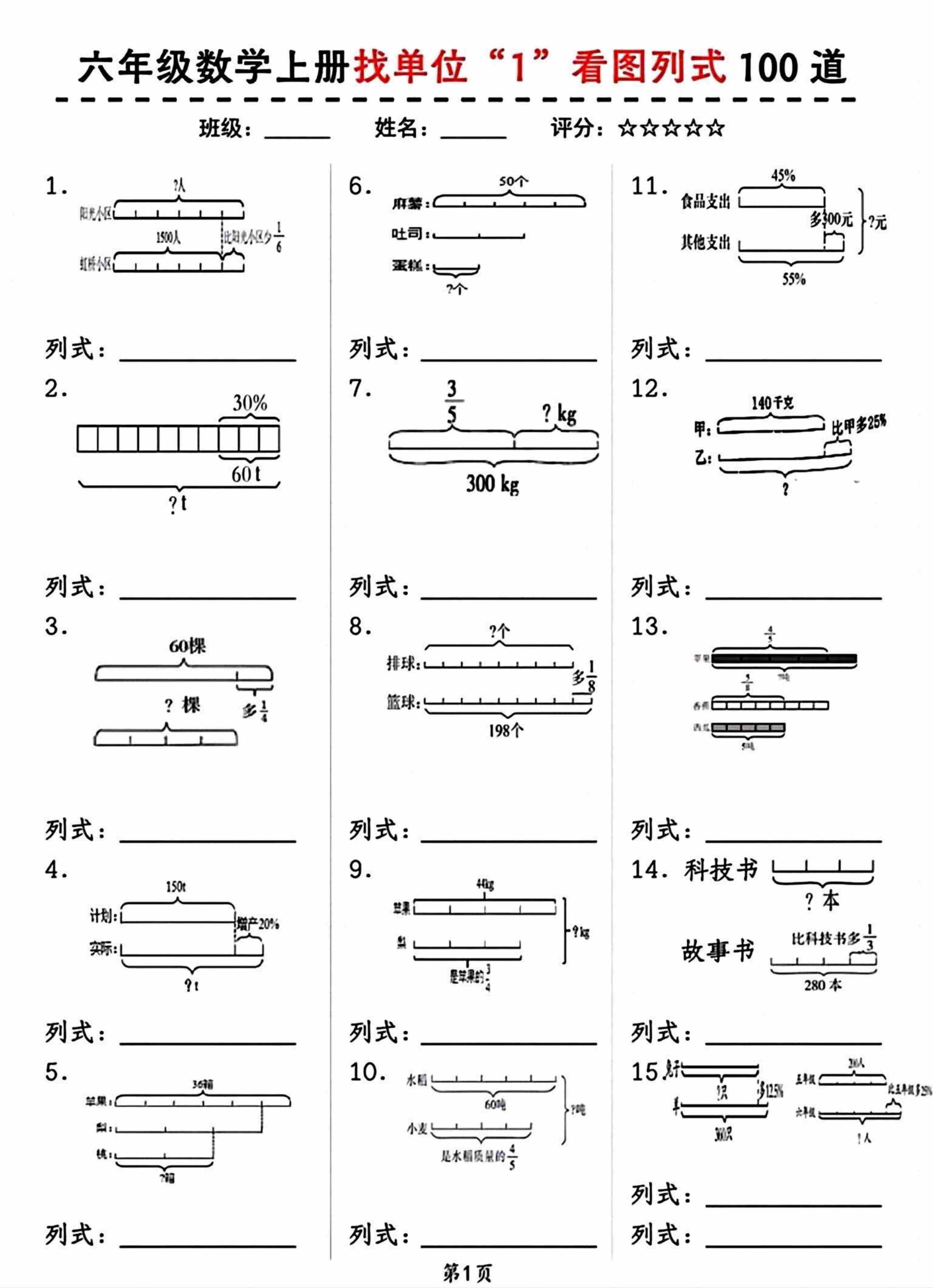 首页 > 全部 > 各平台作品 > 六(上)数学找单元“1”看图列式100道(1)
