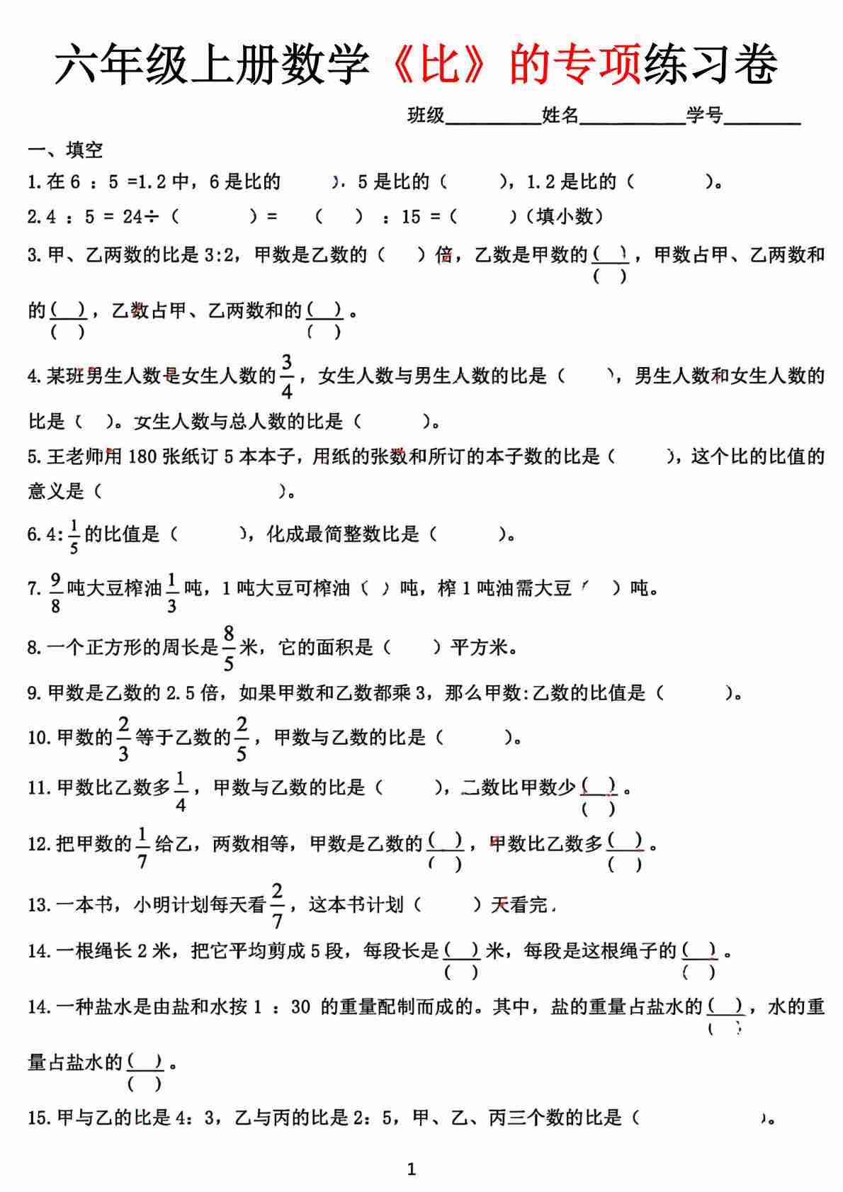 六(上)数学【“比”专项练习卷】