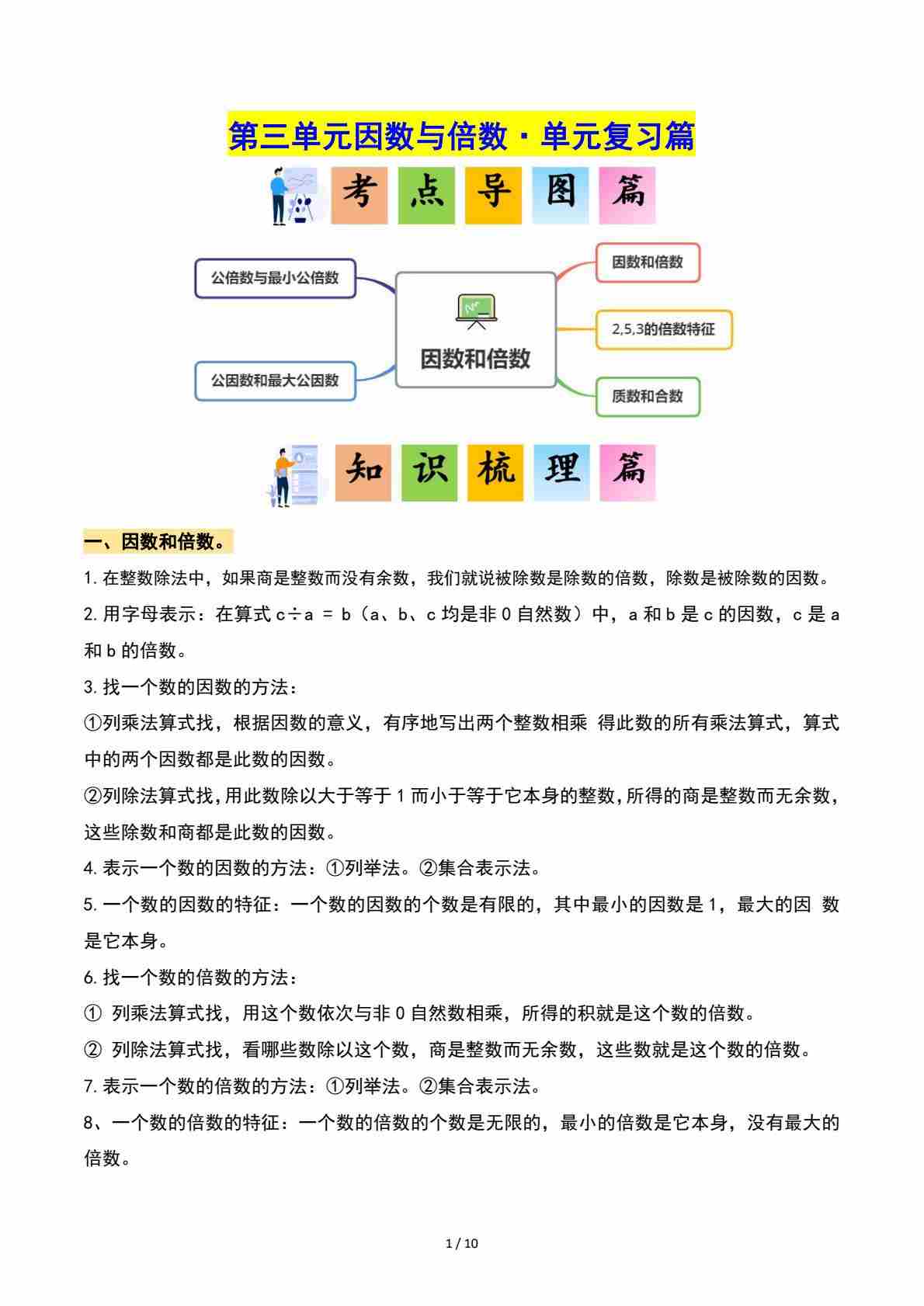 五 (下) 数学苏教版【第三单元:因数与倍数·单元复习篇(原卷版)】